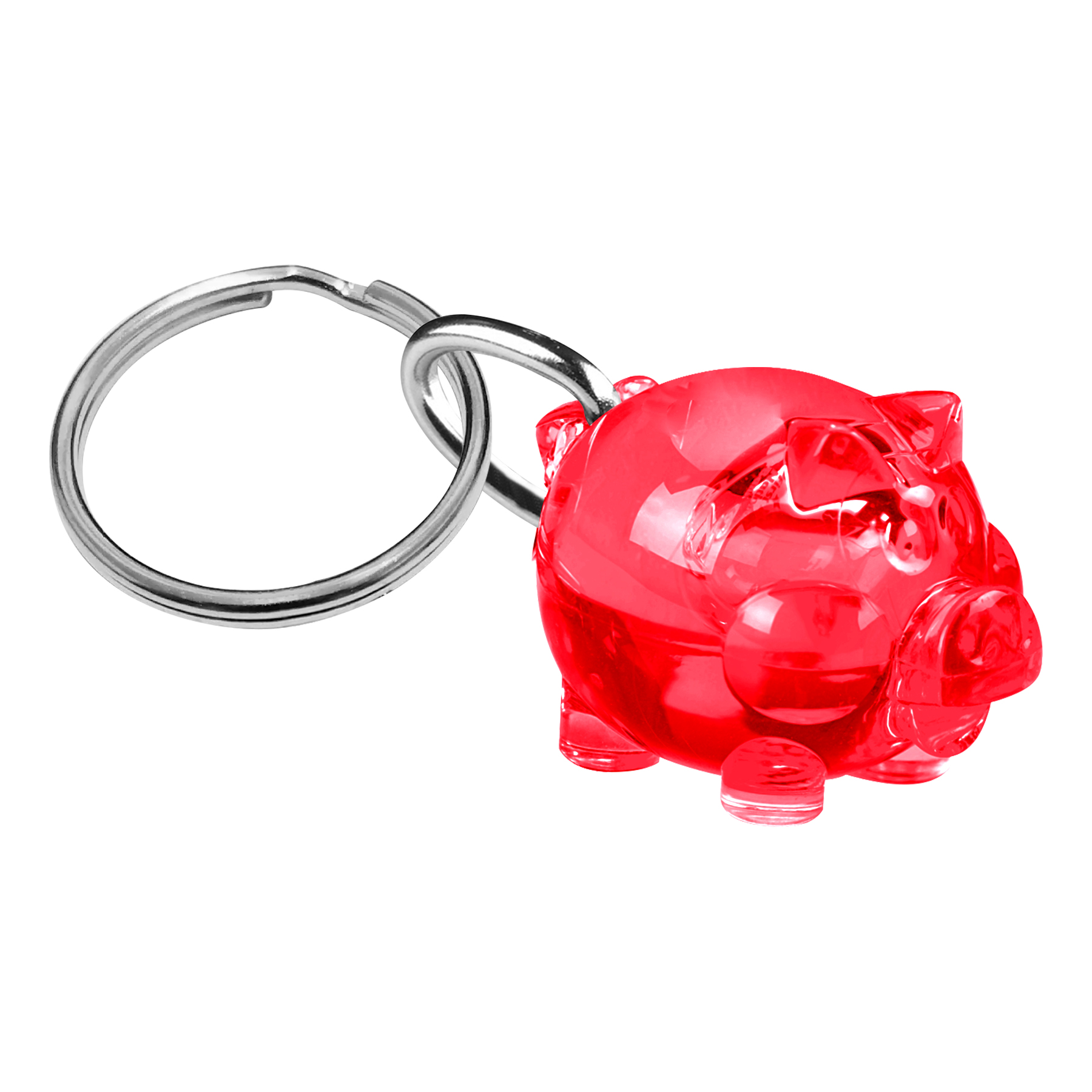 The piggy keychain can be hung on a backpack or purse for easy portability. Made of plastic, and measures 2 inches. Small enough to take when traveling. Ideal give away for trade shows, conferences and school fundraisers. Add your school, sports team, organizational or company logo or message to customize. 1 2/5"L x 1"W x 1"H