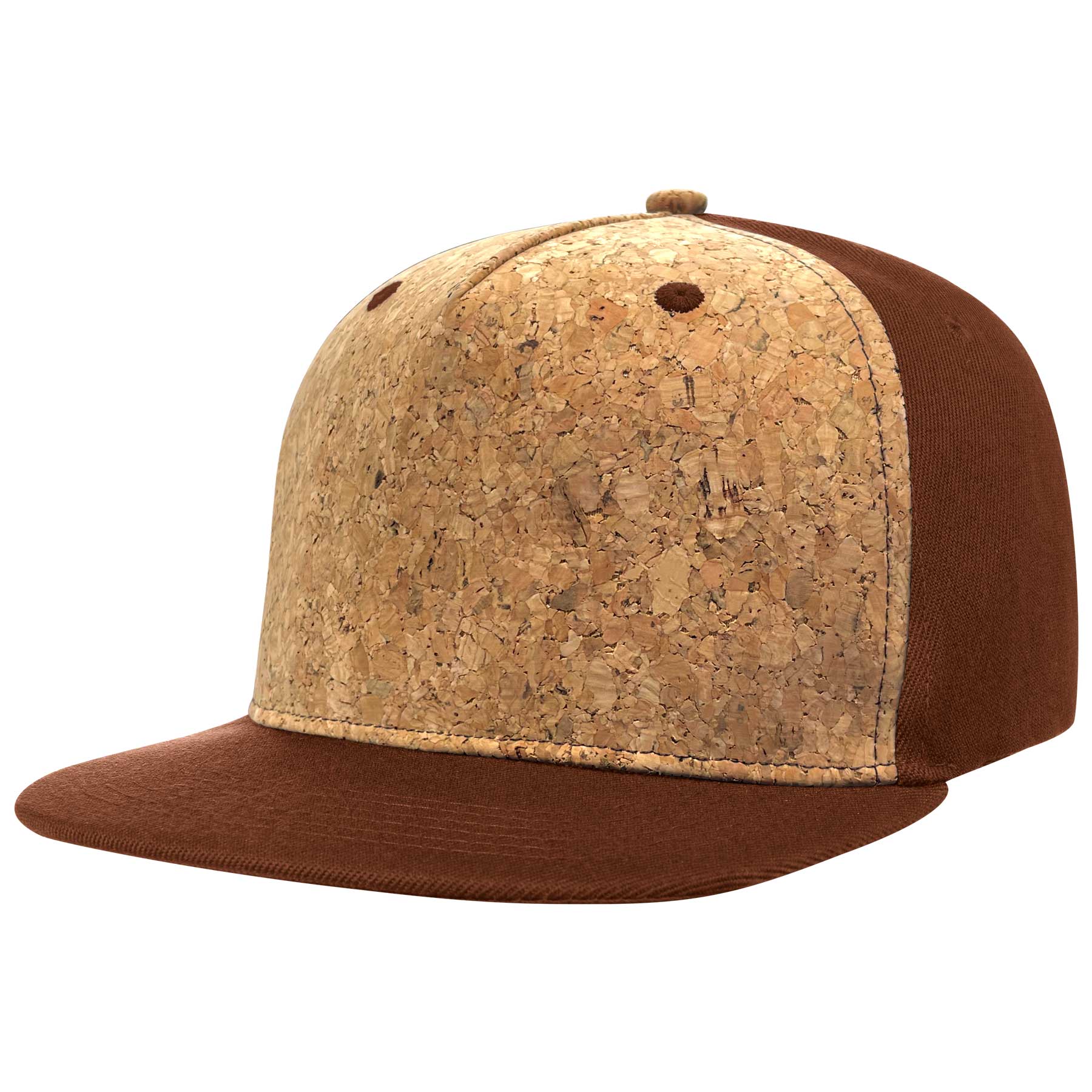 High-quality 5 panel snapback cap is made from polyurthane cork on front and cotton on bill and back panels. 8 rows stitching on visor and adjustable plastic snapback closure. One Size Fits Most. 23" D